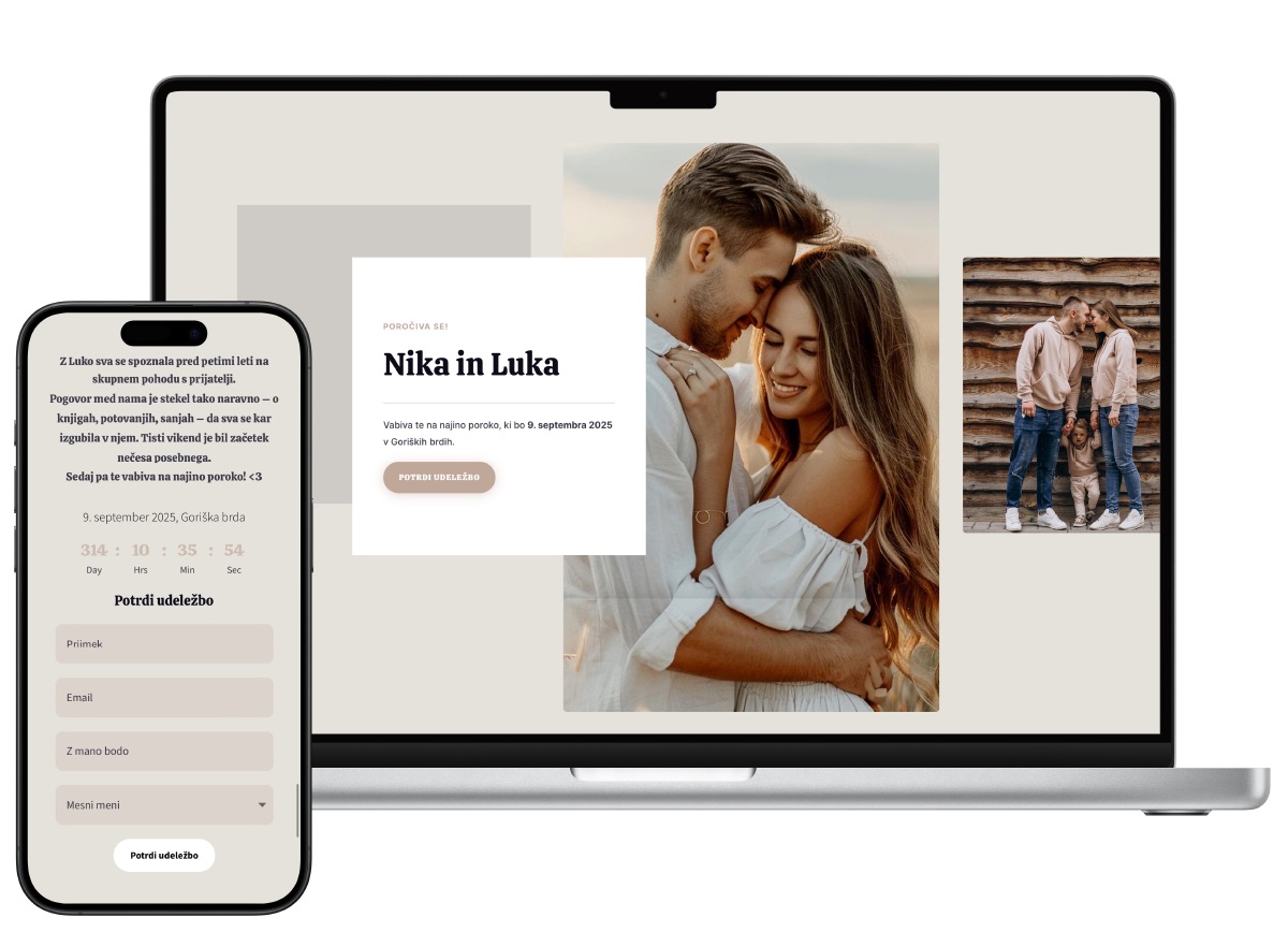 PS: nič več ročnega dela in klicev. Poročna spletna stran omogoča enostavno potrditev udeležbe s samodejnim vodenjem prijav in izbiro menijev.